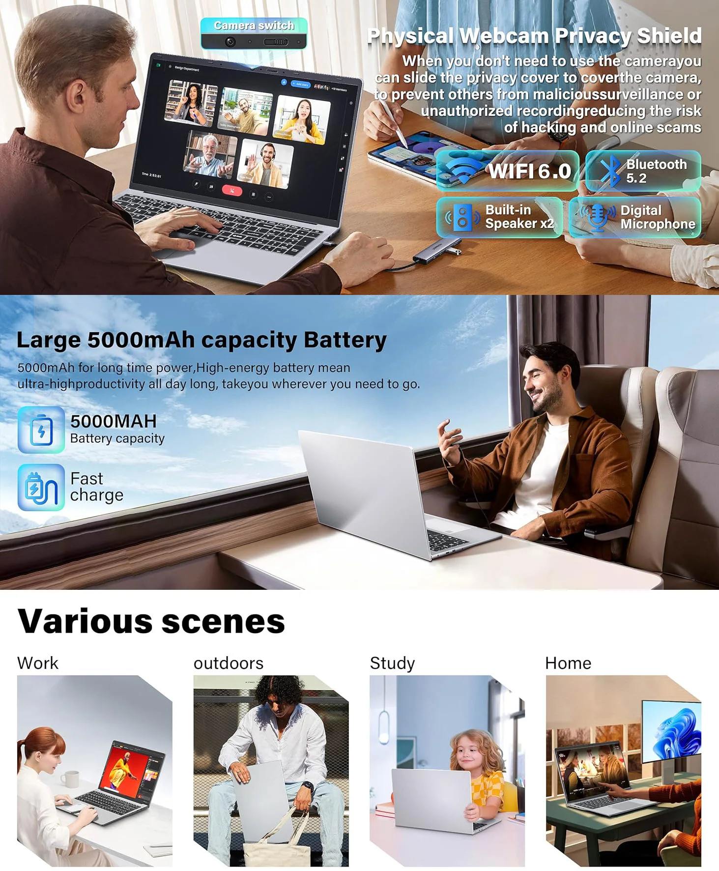 【Long Battery Life】 Take this laptop pc with you anywhere without bringing the power adaptor. Its long battery life gives you the flexibility to work or play anywhere for 5 hours. Equipped with cooling fans to ensure continuous work while minimizing noise, so you won’t be distracted while working on spreadsheets or watching movies.